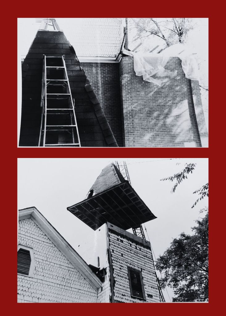 In Spring 1977 the church decided to rebuild the leaning tower and contracted with the Pine Mountain Corporation. The same shingle design was used for the walls. The new tower was put in place using a large crane and stood 75 feet tall. They added a cross to both of the towers. The builders added a base for the church cell, now located to the left of the building.